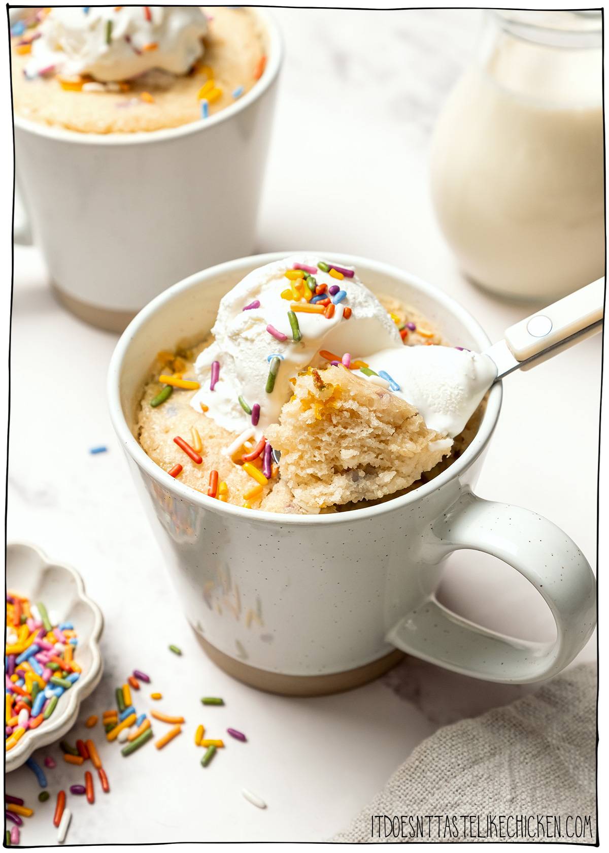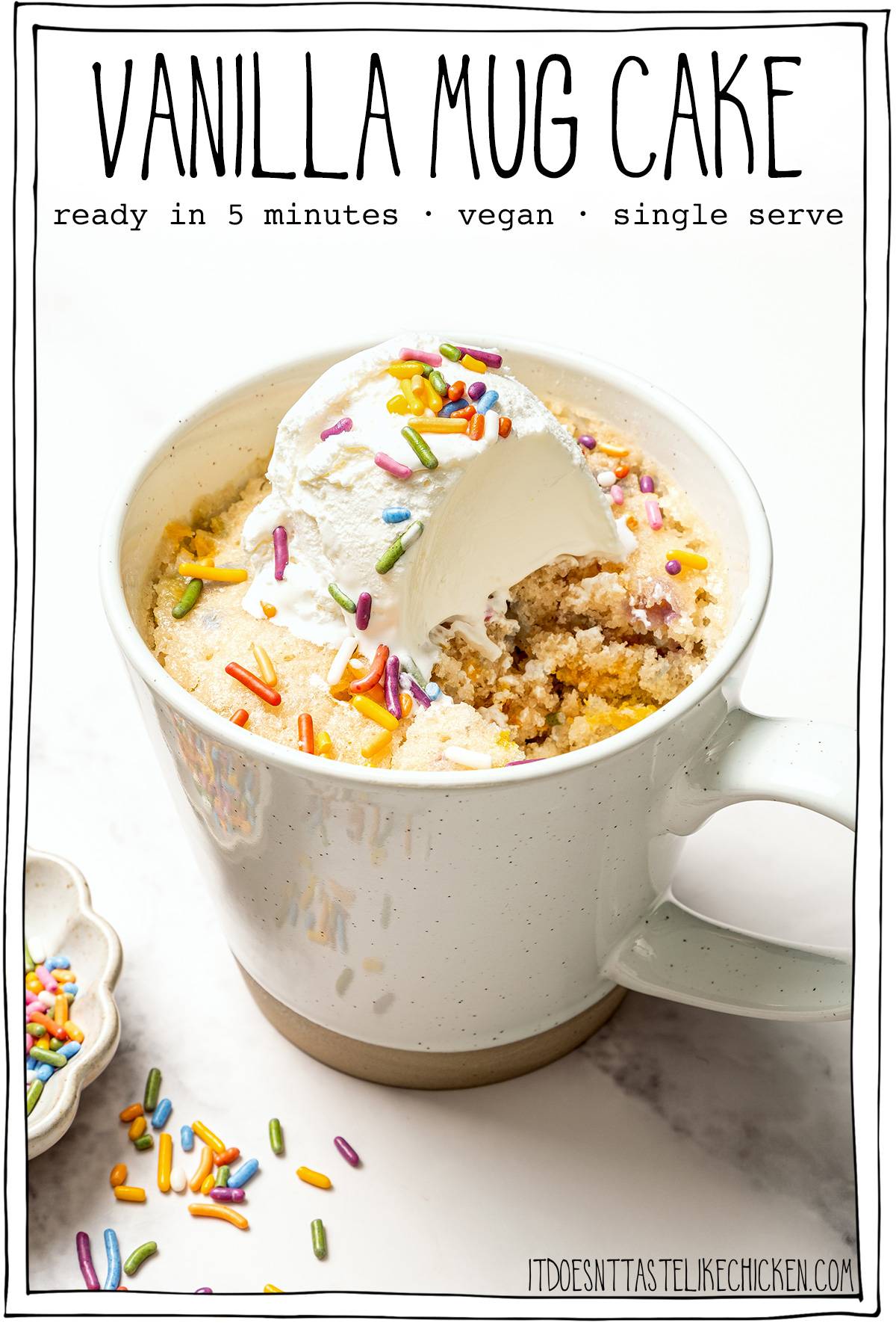 Made with simple pantry ingredients, this quick and easy microwave mug cake recipe is lightly sweet, tender, and delicious on its own or topped with vegan ice cream or whipped cream.
