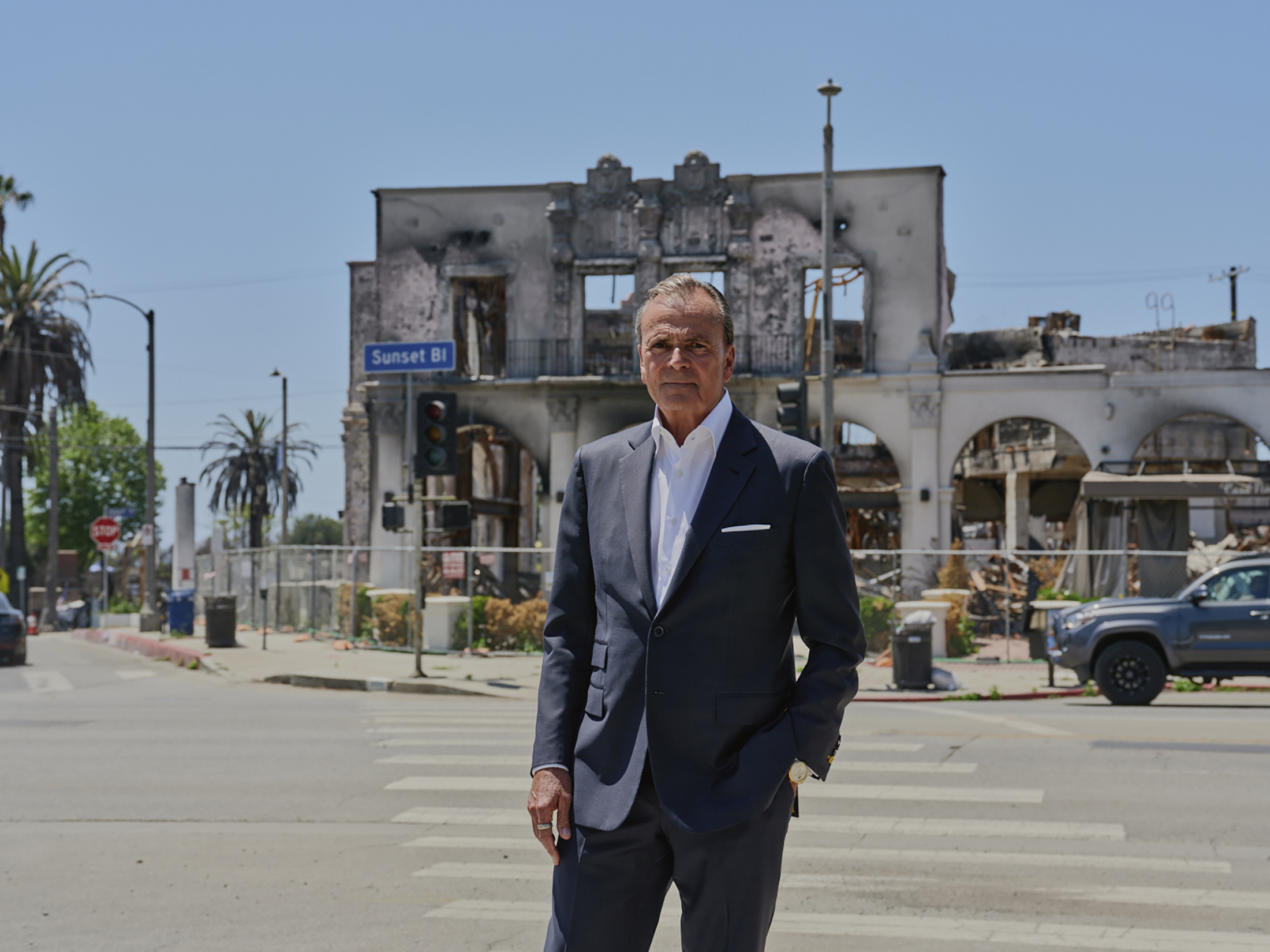 Rick Caruso outside a building destroyed by fire, across the street from his Palisades Village mall in Los Angeles. Photographer: Philip Cheung for Bloomberg Businessweek