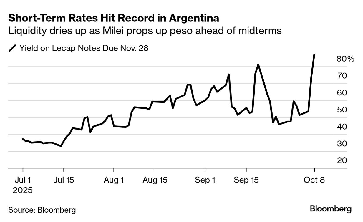 Juros argentinos ultrapassam 80% em meio à escassez de liquidez As taxas de juros de curto prazo da Argentina dispararam na quarta-feira, à medida que o governo intensificou os esforços para defender o peso, aprofundando a escassez de liquidez que sufoca uma economia já frágil.