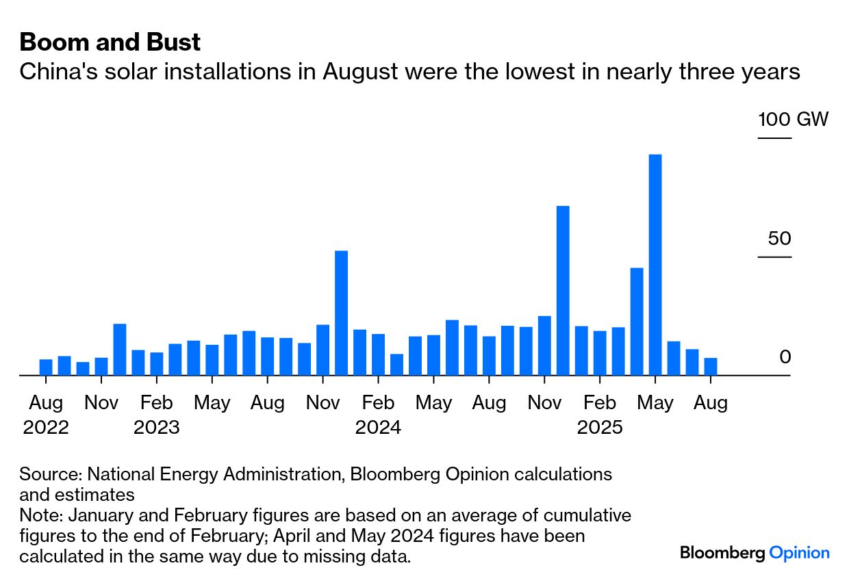 The surprise growth in Asia comes from farther north, in fact, from North Korea. Karishma Vaswani notes that Pyongyang has gotten a big boost from its military sales to Vladimir Putin’s Russia (and its ongoing invasion of Ukraine). Kim Jong Un put much of his product line on parade this week — a point of pride as well as advertising for anyone else who might be interested in spending on his wares. Karishma says the dictator “is now operating from a place of unprecedented strength.” And that’s not good for everyone else. “A nuclear-armed, technologically advancing North Korea is not just a Korean Peninsula problem. It’s a direct challenge to global stability.” “Amid the Trump-induced crisis for clean energy this year, one beacon of hope has stood out: China. While other countries have been winding back their net-zero commitments, the People’s Republic has turned itself into the factory floor of the energy transition. … There’s a problem, however: China’s shift toward renewables has been showing worrying signs of flagging in recent months. Solar installations in August fell to their lowest level in nearly three years, as a building frenzy in the first half of the year gave way to a pronounced hangover.” — David Fickling in “Trouble Is Brewing in Solar Power’s Heartlands.” “The conventional wisdom says liquified natural gas is the future of energy — bridging the gap between the world abandoning fossil fuels and renewable supplies coming online. But that rosy outlook faces a reckoning. LNG is threatened by a pincer movement involving, ironically, the two old and new sources it’s supposed to bridge: coal and solar. The cracks in the bridge could not have appeared at a worst time. The LNG market is about to witness its third big wave of increased supply in 20 years. If demand growth is weaker than expected, the only way the market would rebalance is via much lower prices.” — Javier Blas in “Liquified Natural Gas Risks Becoming a Bridge to Nowhere.” Trump deserves credit for the Gaza ceasefire, but the Nobel? — Marc Champion Tariffs are a dish best eaten cold. — Andrea Felsted What’s luxurious about mooncakes and plastic? — David Fickling Greenhushing! Don’t say it out loud. — Lara Williams A radical path to stock market glory. — Chris Hughes The unnumbered victims of AI. — Catherine Thorbecke The rational exuberance of risky bank . — Marcus Ashworth Don’t count the dollar out yet. — Daniel Moss Will you be paying your plumber in Tether? — Paul J. Davies Walk of the Town: The Church on Maiden Lane | A very old restaurant presides over Maiden Lane here in London. Rules — named for its founder Thomas Rule — has been in existence since 1798 and has been a cultural touchstone in the city, even appearing in Graham Greene’s The End of the Affair. A church also figures in the novel — where a character goes through an intense spiritual struggle over an illicit love affair. That would be Corpus Christi Catholic Church, just a few doors down and about a century younger than the restaurant. It now hosts a shrine to St. Carlo Acutis, a 15-year-old website creator who was canonized by Pope Leo XIV just a month ago. The shrine to St. Carlo Acutis is to the left in the Lady Chapel of Corpus Christi. Photograph by Howard Chua-Eoan/Bloomberg The sculpted image of the newly-minted saint — holding a laptop and a chalice, with a relic of his hair in a little container beneath — hangs to the side of the church’s lady chapel. This week, I wrote about what a phenomenon he’s become among young Catholics, including techies in Silicon Valley. His vibrant image is a moving contrast to Maiden Lane’s memories of Greene, a Catholic convert whose other great novel, The Power and the Glory, elicited questions from the Vatican about its doctrinal soundness. That book’s central character is a nameless “whisky priest” who wrestles with faith and belief, yet in the end emerges as a kind of saint. It’s a different kind of sanctity than the young saint now celebrated at Corpus Christi. Light exercise after a meal may be good for digestion. “Yes, you can gorge and swim. I just ate every person at the pool and am still afloat.” Illustration by Howard Chua-Eoan/Bloomberg Notes: Please send staycation vibes and feedback to Howard Chua-Eoan at hchuaeoan@bloomberg.net. Sign up here and find us on Bluesky, TikTok, Instagram, LinkedIn and Threads. |