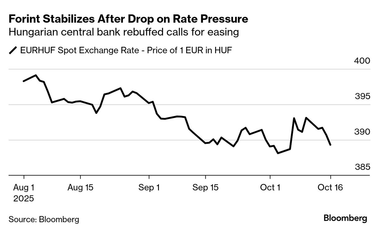 Hungary’s forint steadied against the euro after central bank Governor Mihaly Varga and his team went on a publicity tour to emphasize their commitment to tight monetary policy and a stable currency to fight inflation. That mostly calmed investor concerns, for now, about pressure from Prime Minister Viktor Orban and his economy minister, who triggered a slide in the Hungarian currency with calls for more monetary stimulus earlier this month.
