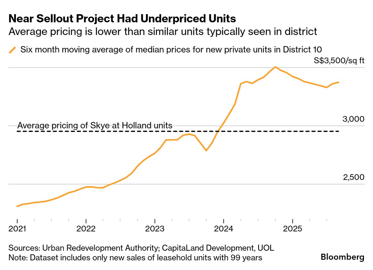 Last weekend saw buyers snap up about 658 of 666 units on offer at the Skye at Holland in the best-selling residential launch this year. The properties sold at an average S$2,953 per square foot. That might seem expensive, but the development was actually marketed at a slight discount to similar units in the neighborhood of Holland Village, one of Singapore’s top expatriate enclaves.