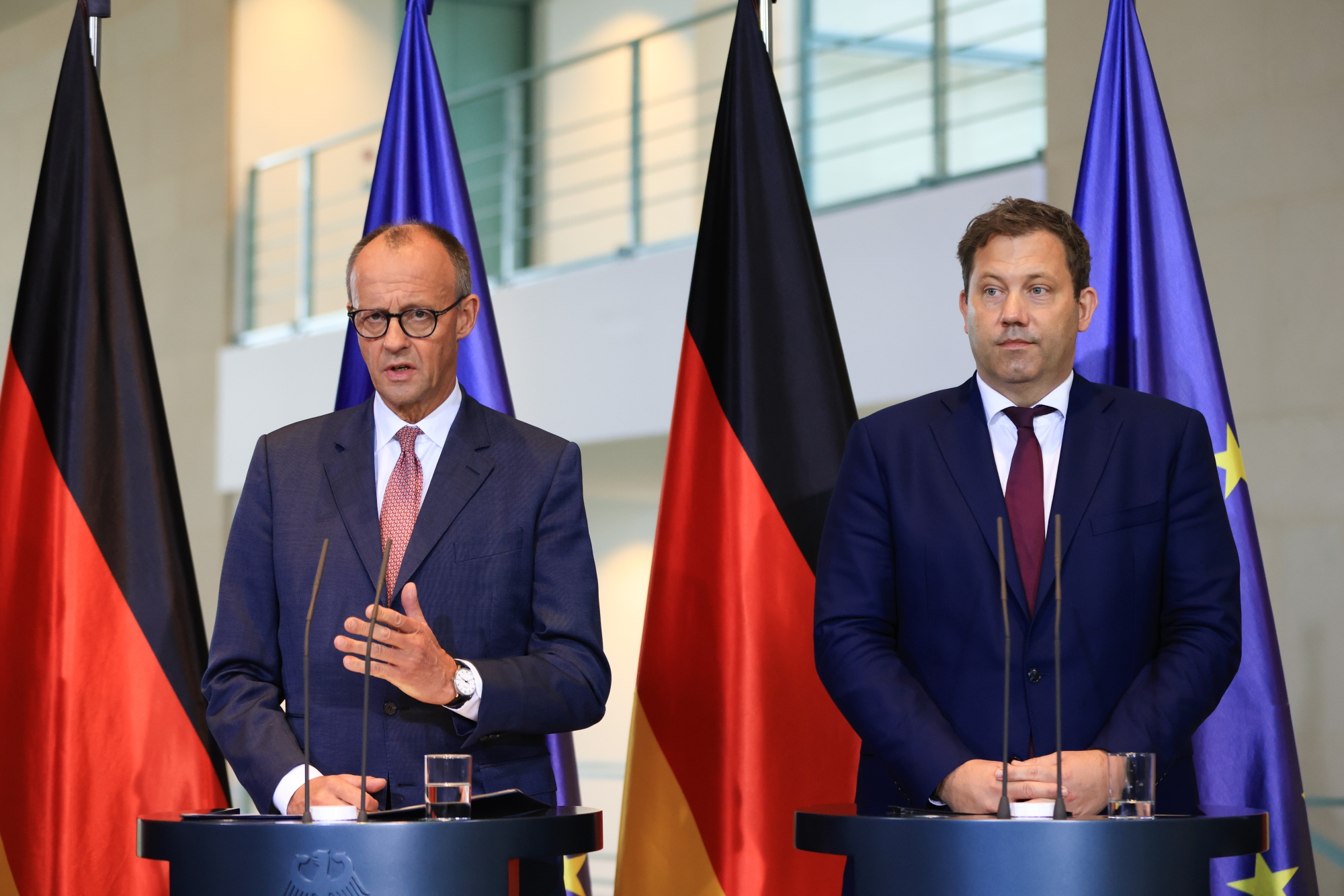 Müssen den Laden zusammenhalten: Bundeskanzler Friedrich Merz (CDU), links, und Bundesfinanzminister Lars Klingbeil (SPD). Foto: Krisztian Bocsi/Bloomberg