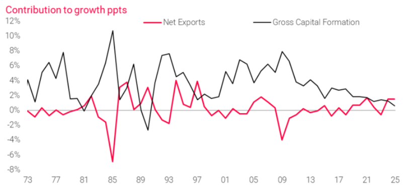 These numbers suggest that the exports push can’t be hurting that much. Rory Green of TS Lombard suggests the two are closely linked: