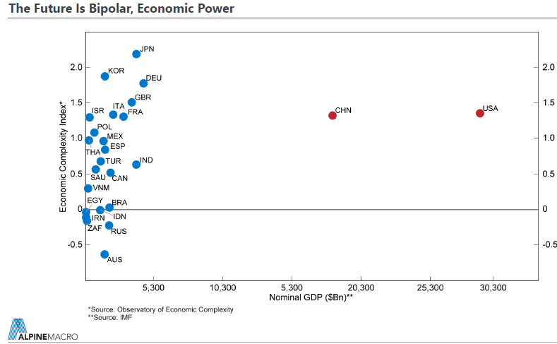 The market frisson also demonstrated that it’s the conflict between the US and China that matters. The various other global trade conflagrations are deemed far less important, which makes sense as these economies are by far the two superpowers. This chart is from Dan Alamariu, geopolitical strategist at Alpine Macro: