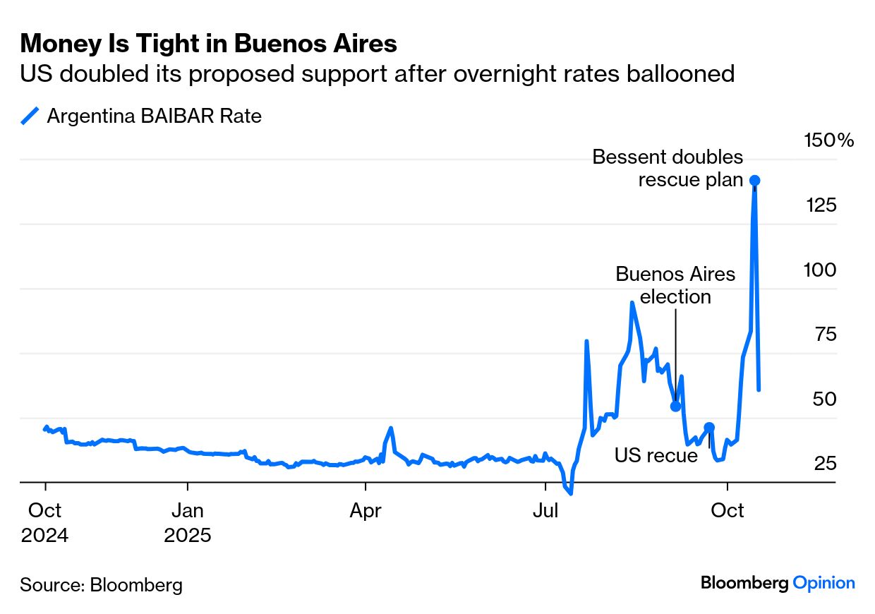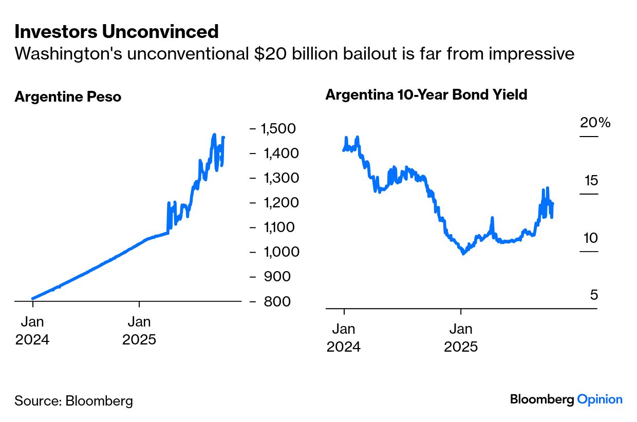 Ordinarily, a US Treasury backstop in times of crisis is as good as money in the bank — or so Argentina’s President Javier Milei thought. The reality is proving far more complicated. Treasury Secretary Scott Bessent, who was already backing Buenos Aires with a $20 billion rescue package, is now wagering another $20 billion to buy pesos that he, surprisingly, considers undervalued.