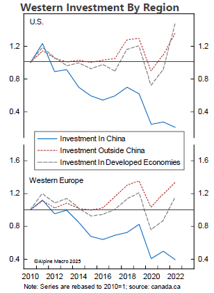 Debate also continues to rage over exactly who holds the greater leverage. The US has the dominant companies that make the chips needed for artificial intelligence, headed of course by Nvidia Corp. But China, as it reminded everyone earlier this month, has rare earths, in which it has spent decades building dominance. It also has far greater ability to withstand pain than the US, as its leaders don’t have to win elections. The two sides have been steadily sundering their relationship for a while. This chart from Alamariu demonstrates that both Western European and US investors have long been deploying capital elsewhere: