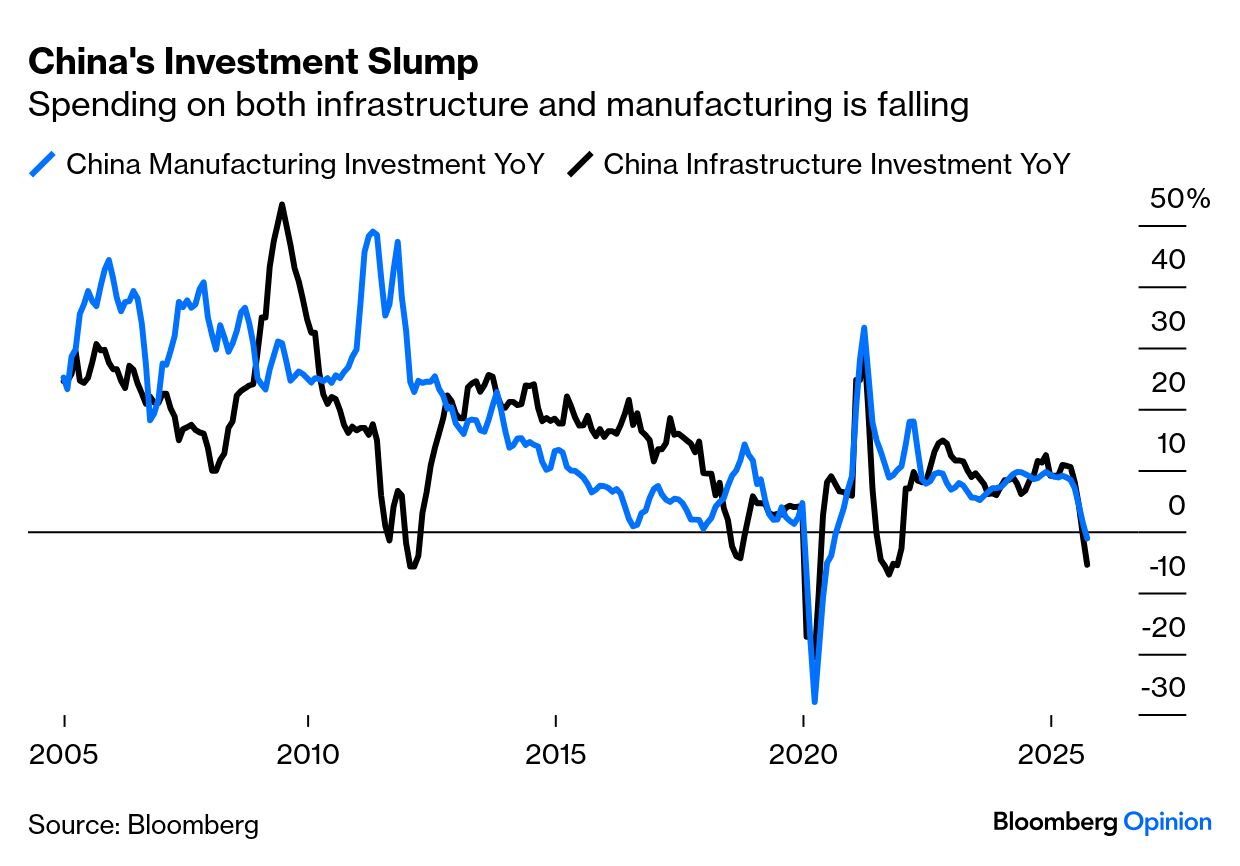 This means that China remains on course for the official government target of 5% economic growth for this year. It would be amazing if it missed this manufactured target, but it still suggests that Beijing has room for maneuver. It’s also managing to do this despite a slump in investment in infrastructure and manufacturing, the usual standbys. Both are falling in annual terms; that hasn’t happened in modern times outside the pandemic year of 2020: