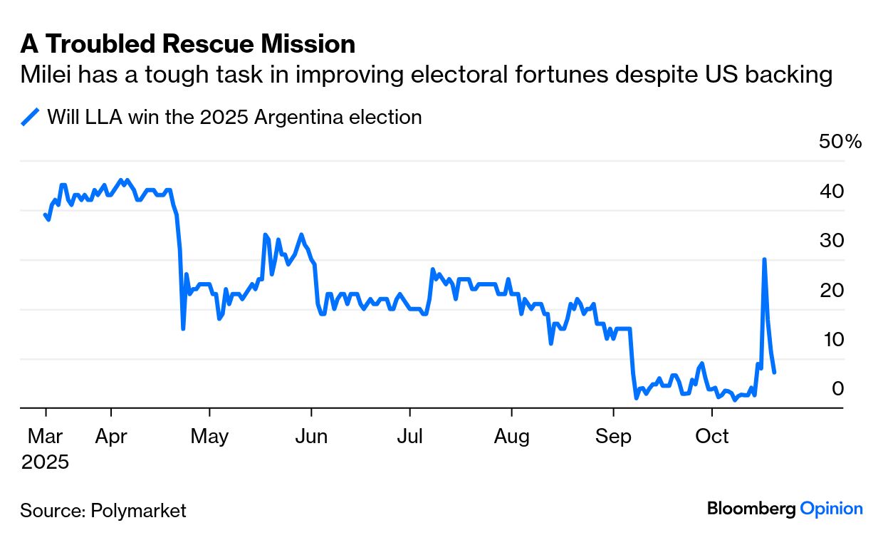 But the US support comes with strings attached, as Trump has made clear. If Milei flops at the polls, the US backstop will no longer be there. The more investors sense the race slipping away from him, the faster economic confidence could erode. Polymarket’s odds on Milei’s chances of building the largest congressional delegation have receded all year, and dwindled again after the Washington rescue: