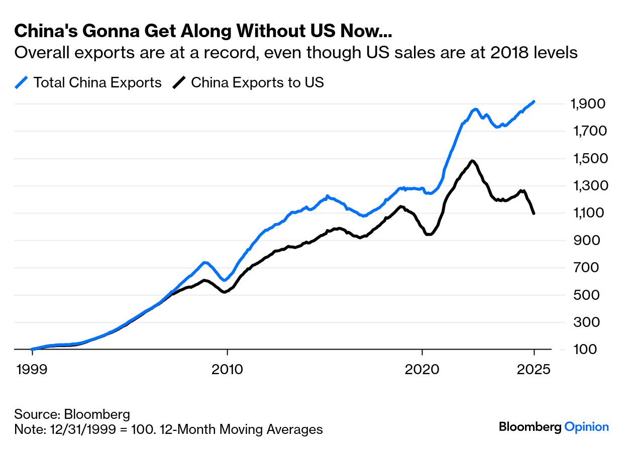 Meanwhile, China has redoubled efforts to find alternative markets for its exports. The latest numbers show total exports at a record, even as sales to the US dip back to a level reached in 2018: