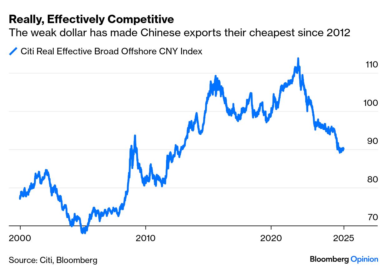 There are issues over whether China is essentially dumping goods on others. That could mean uneconomically poor margins for Chinese companies, and raise the risk that countries other than the US feel obliged to retaliate with tariffs of their own. But it has been helped, perversely, by the weak dollar. The yuan remains tied closely to the US currency, and that has made it far more competitive: