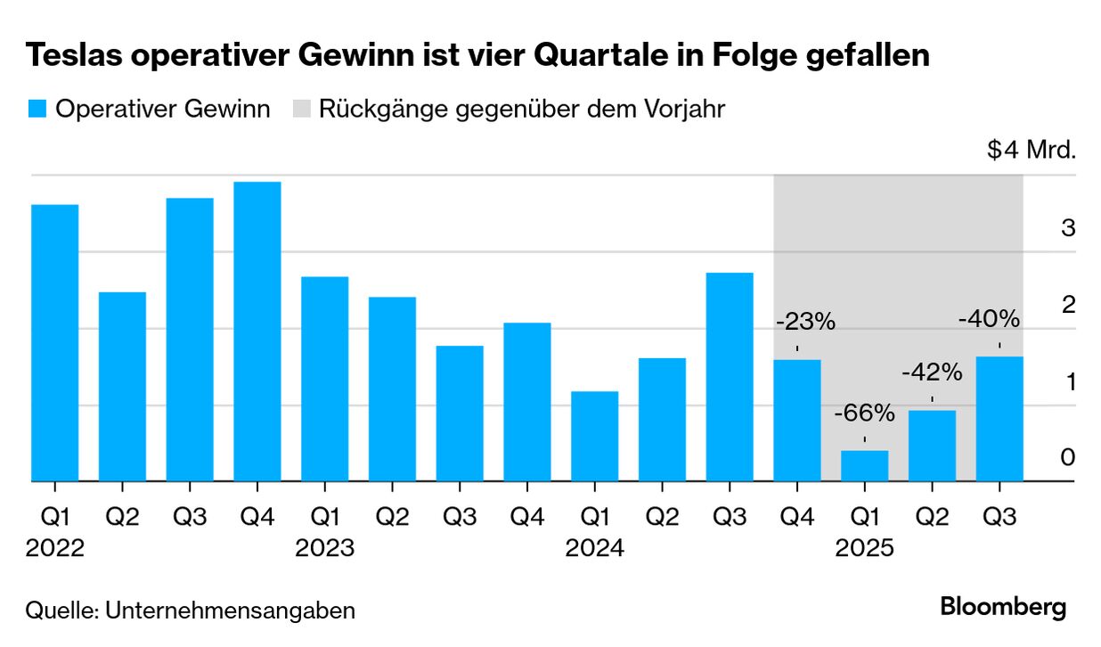 SAP hat beim Wachstum in der Cloud die Erwartungen verfehlt — ein Zeichen dafür, dass Handelskonflikte und schwächere Konjunktur das Geschäft von Europas wertvollstem Softwareunternehmen belasten. Der bereinigte Umsatz in dem Bereich erreichte im dritten Quartal 5,29 Milliarden Euro. Analysten hatten 5,33 Milliarden Euro prognostiziert. Im Gesamtjahr hält das Management beim Cloud-Umsatz nur noch den unteren Rand der Zielspanne für realistisch. An der Börse ging es für SAP 3% abwärts, womit die Titel gegenüber dem Jahreswechsel ins Minus gerutscht sind. Besser laufen könnte es auch bei Tesla. Steigende Kosten haben zu einem 40%-Einbruch des operativen Gewinns geführt, obwohl der E-Autobauer beim Absatz ein Rekordquartal vermeldete. CEO Elon Musk sprach indessen lieber über Zukunftsprojekte wie die humanoiden Roboter des Unternehmens und KI-Programme – und warb erneut für sein eigenes Vergütungspaket im Wert von einer Billion Dollar. Im vorbörslichen Wall-Street-Handel sind die Tesla-Titel heute rund 4% billiger zu haben. Einen 40%-Kurssprung macht die Aktie von Volvo Cars. Die Schweden-Papiere profitieren vom Sparprogramm des Konzernchefs Hakan Samuelsson. | |