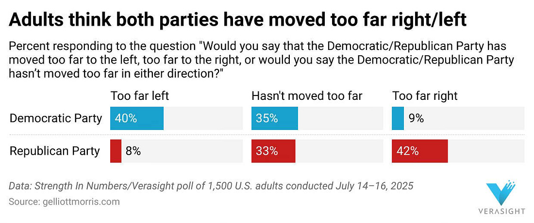 And yet as unpopular as Trump is, the Democrats seem to be in even worse shape. The two parties are neck and neck in terms of approval, with the GOP slightly ahead, even though a thermostatic reaction to Trump’s overreaches and blunders ought to be making the Dems more popular right now. And despite the fact that Trump is talking about a third term and ending birthright citizenship and cracking down on the press etc. etc., people perceive the GOP as no more extreme than the Dems: