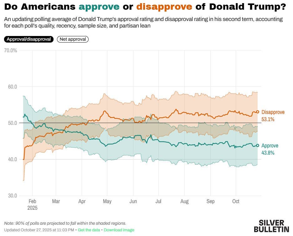 The Trump administration is not doing a good job. Tariffs are punishing the U.S. economy. Masked federal agents are rampaging through the streets of American cities, grabbing people off the street. Corruption is rampant. The people Trump put in charge of the country’s public health services don’t even believe in the germ theory of disease. And as a result, Trump’s approval rating keeps slipping: