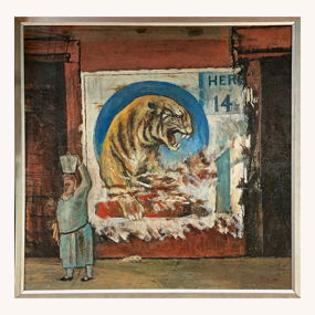 Signed. Paint on board with attached metal tongue and fang. Excellent condition. 14" w x 13" h including frame. Provenance: The Gary Schwindler Collection. Est. $2,000-4,000.