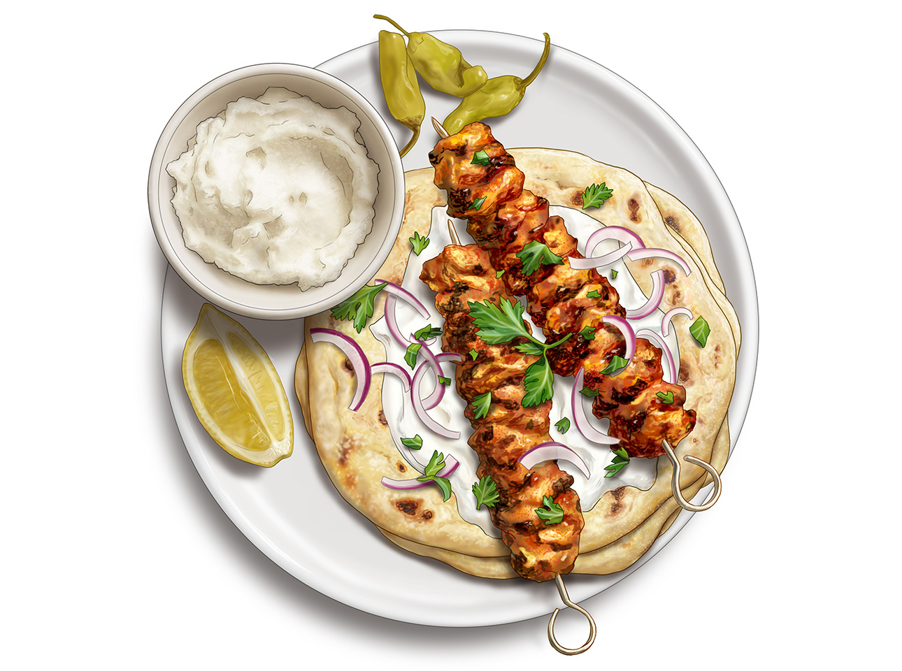 This week’s Middle Eastern-inspired recipe uses quality chicken marinated in plenty of spices, accompanied by a punchy garlic dip. Easy does it.