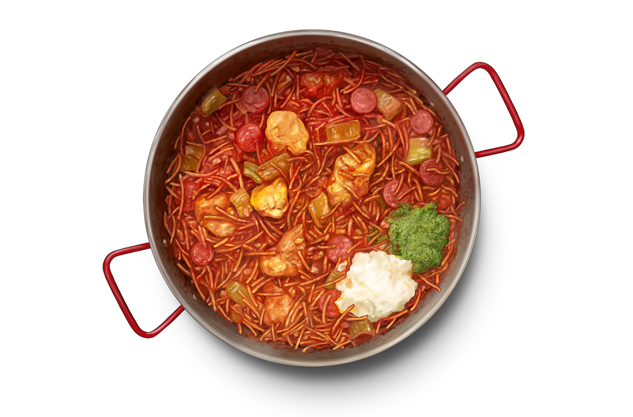 Similar in its flavour profile to the popular paella, fideuà hails from Valencia and calls for a short pasta shape, called fideos, instead of rice. To infuse this dish with a roasted aroma, it’s recommended to cook it over an open fire – though a pan on the stove will also work. To top it off, this fideuà goes well with aioli and hazelnut-and-parsley salsa picada.