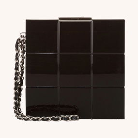 This Chanel Choco Bar Lucite Perspex Clutch is a stylish accessory crafted from durable plastic, featuring a sleek black color and a distinctive lucite design.