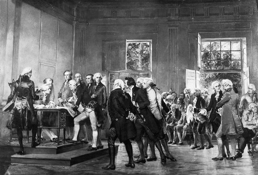 The Declaration of Independence is signed. (Painting by Sara Paxton Ball Dadson)