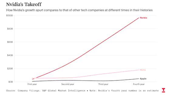 Nvidia’s free cash flow has mushroomed from $3.8 billion in the year to January 2023 to an estimated $96.5 billion in the year ending this coming January, a period when its sale of specialized chips for AI took off. That revenue growth represents a compound annual growth rate of 194%. A scan of the biggest tech firms’ financial history going back to 1990 suggests that’s a faster rate of growth than any experienced during any three-year period in that time. The only period that comes close is Apple’s takeoff in the years immediately after it introduced the iPod in 2001. (See chart above).
