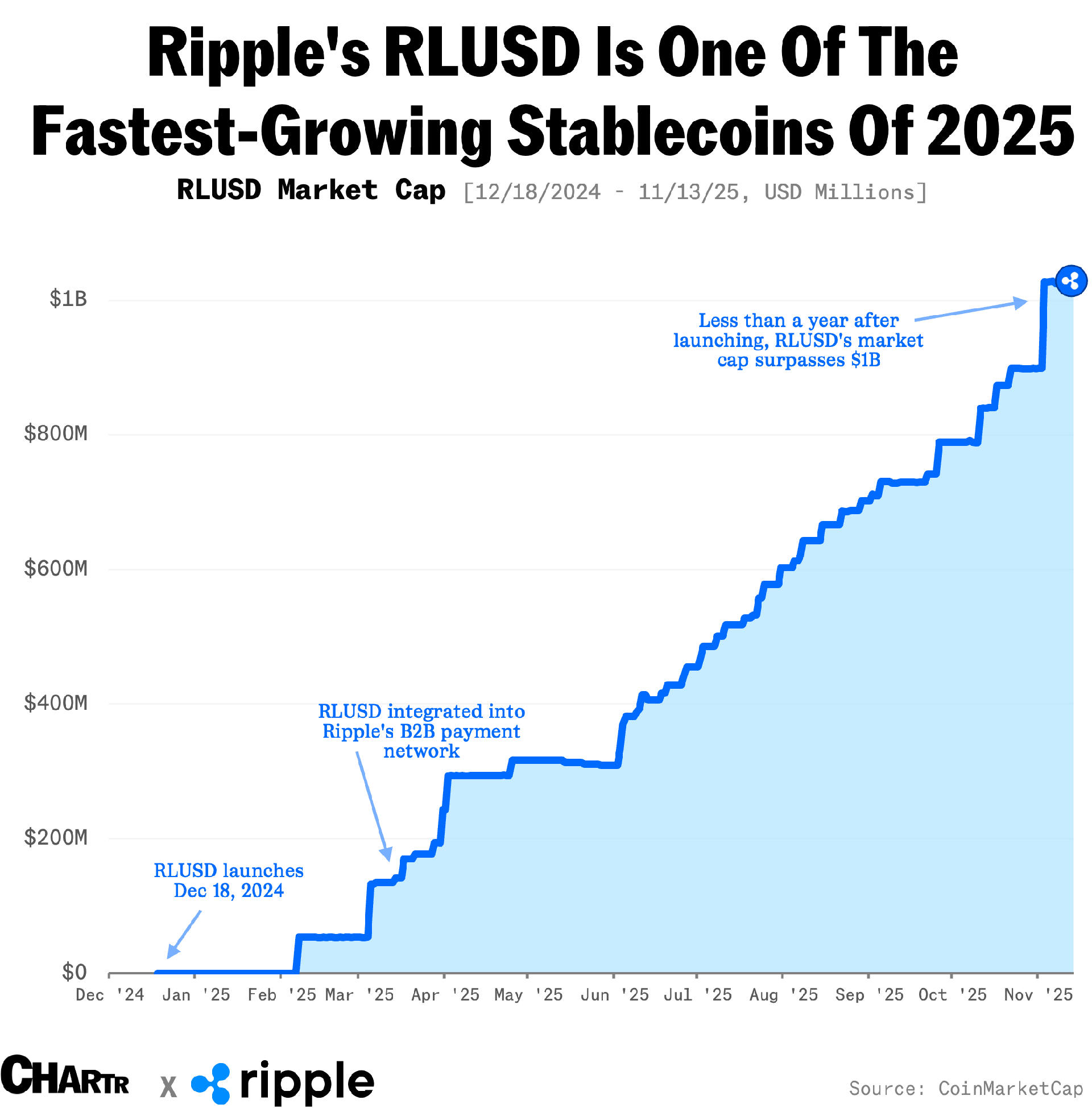 Ripple's RLUSD is one of the fastest-growing stablecoins in the world right now. Its market capitalization has seen more than 10x year-to-date growth (surpassing $1B market cap as of November 3) and it’s now one of the world’s top ten stablecoins by cap.1