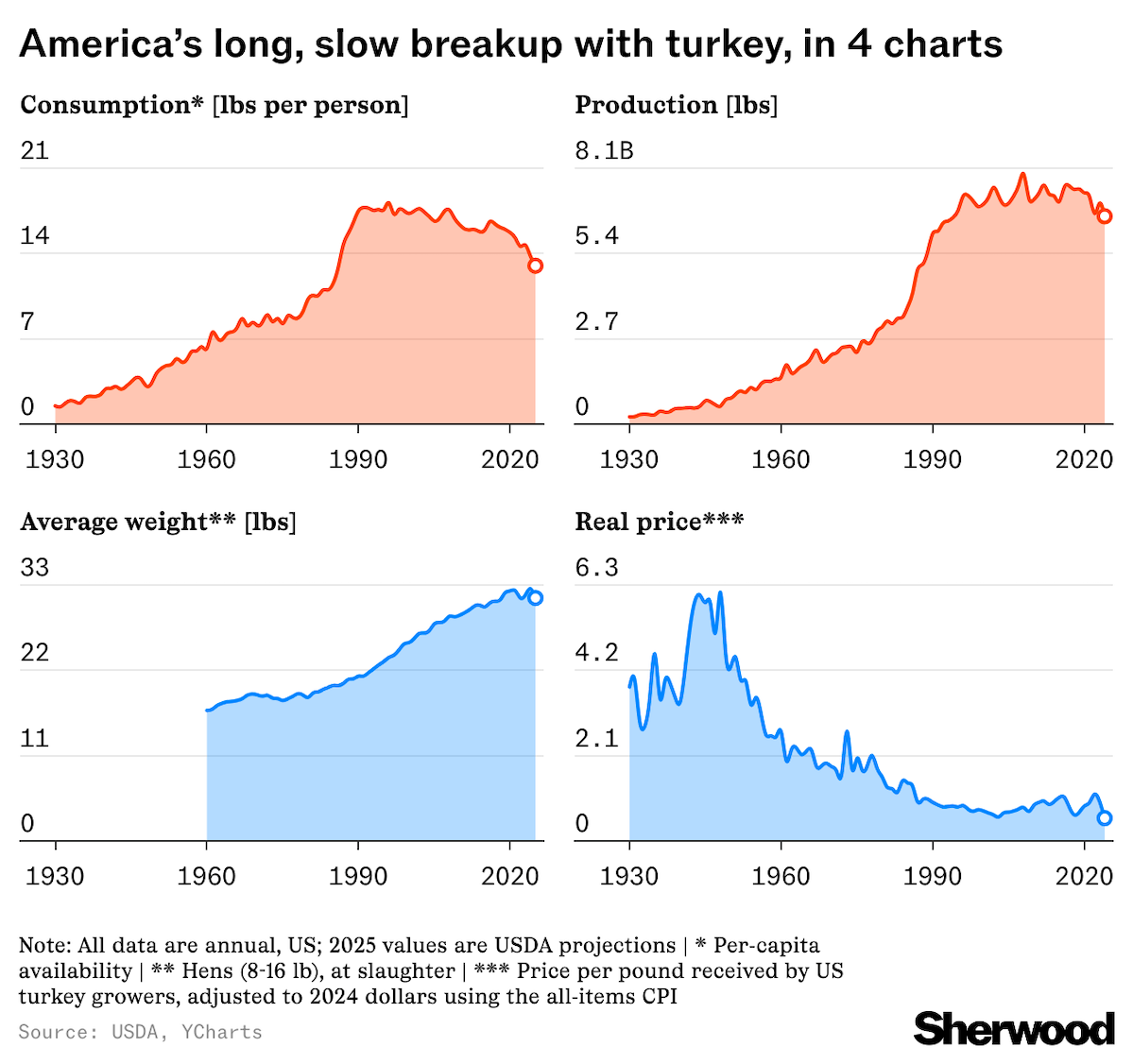 From the 1970s to the 1990s, per-capita turkey consumption in the US nearly doubled after it gained popularity as a leaner alternative to red meat. However, consumption has dropped 25% since peaking in 1996, while chicken, pork, and beef continue to dominate. With turkey demand down — whether that's because it’s too hard to cook, too big for everyday meals, or there are simply tastier cold cuts available production followed suit, slipping to a 30-year low last year.