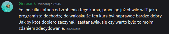 Masz wsparcie na Discord dedykowane pod kazdy kurs. Nasza społeczność i twórcy kursów są dla Ciebie by Cię wyciągnąć. Bez hejtu! Nie zostajesz z problemami sam.