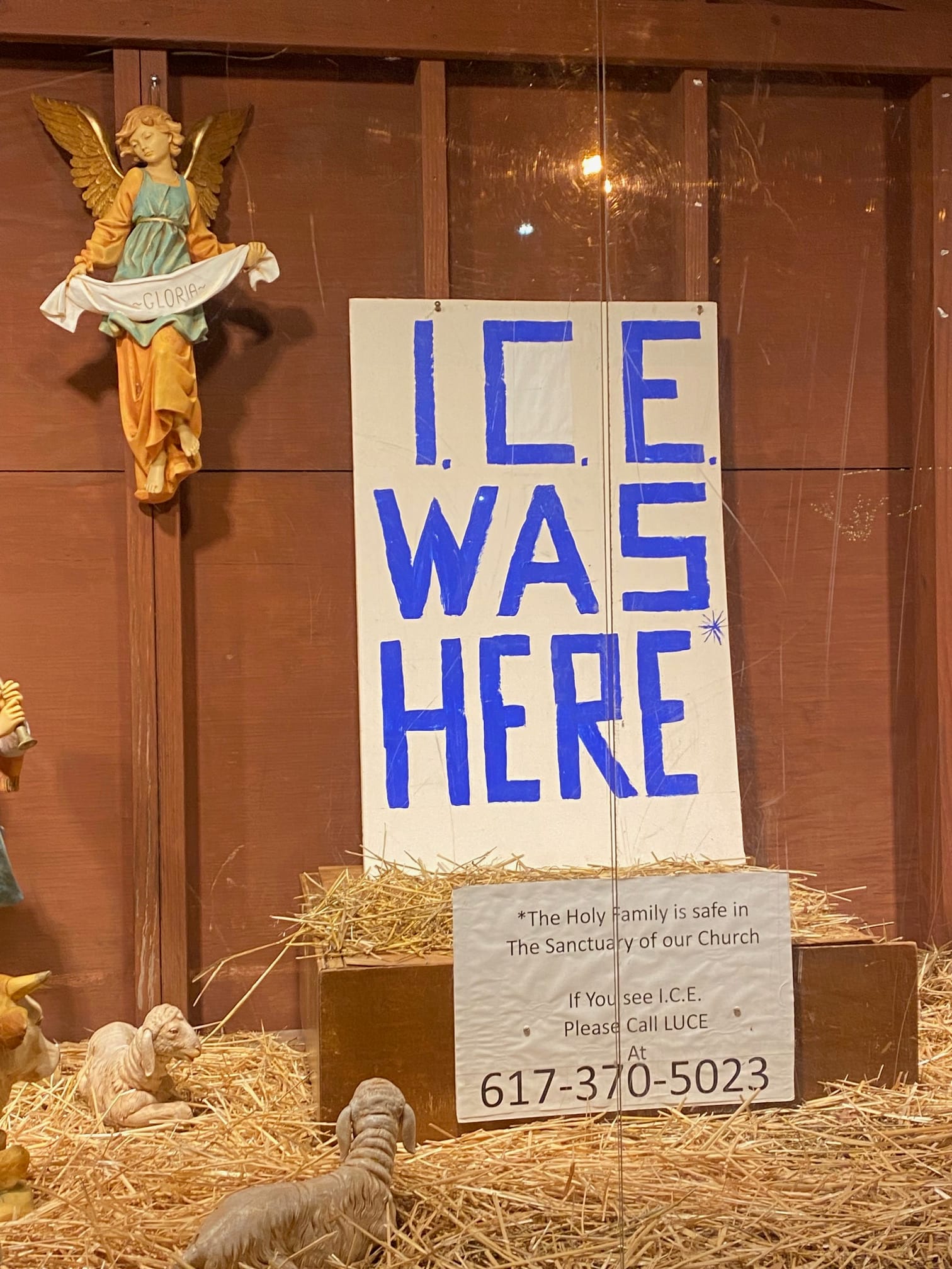The Archdiocese of Boston is calling for a pastor in Dedham to remove a Nativity display that depicts Jesus, Mary, and Joseph as taking sanctuary in the church to try to avoid U.S. immigration authorities. “ICE WAS HERE,” a sign in the Nativity scene outside St. Susanna Church in Dedham says, above another sign that says “The Holy Family is safe in The Sanctuary of our Church” and provides a telephone number to call if the reader sees U.S. Immigration and Customs Enforcement agents. On Friday afternoon, a spokesman for Archbishop Richard Henning, the archbishop of Boston, issued a statement saying that the Nativity display sends a political message that is inappropriate. “The people of God have the right to expect that, when they come to church, they will encounter genuine opportunities for prayer and Catholic worship — not divisive political messaging. The Church’s norms prohibit the use of sacred objects for any purpose other than the devotion of God’s people. This includes images of the Christ Child in the manger, which are to be used solely to foster faith and devotion," the archdiocese's statement, issued by archdiocese spokesman Terrence Donilon, says. It continues: "Regarding the recent incident, St. Susanna Parish neither requested nor received permission from the Archdiocese to depart from this canonical norm or to place a politically divisive display outside the church. The display should be removed, and the manger restored to its proper sacred purpose.” The Nativity display, which has drawn national coverage, was still up in front of St. Susanna Church as of 5 p.m. Friday, December 5, when a reporter from New Boston Post visited the church and took the photos that accompany this story. Father Stephen Josoma, the pastor of St. Susanna, could not immediate be reached for comment during the late afternoon Friday.