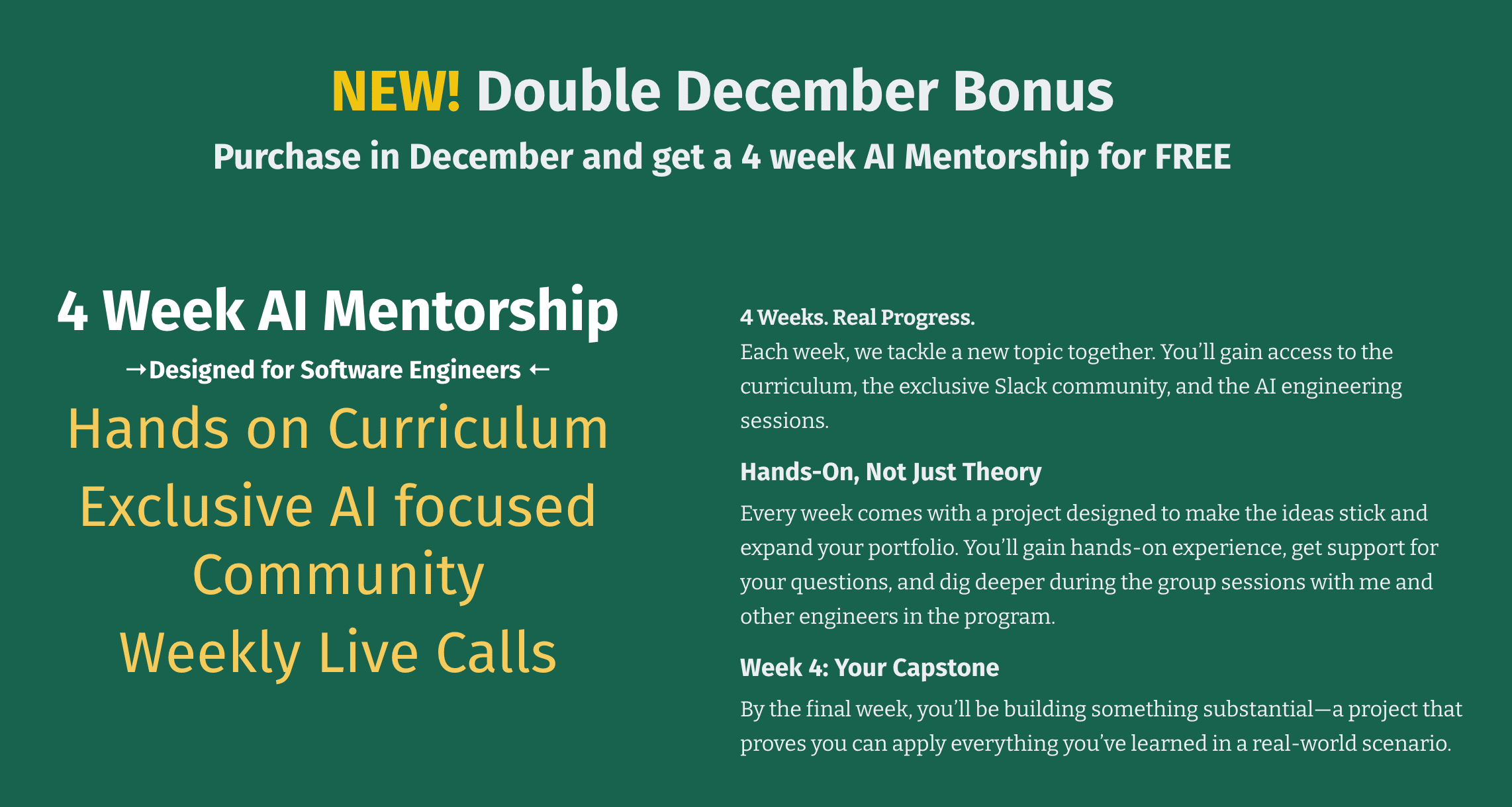 It's only being offered as a free bonus as this will be the very first AI mentorship cohort. I'll be investing the most possible in to this in January to give everyone the best experience possible. That's dedicated time that I would typically invest in creating new content. all completely free. So while I hate to be the "get it now before it's too late" guy, I truly encourage you to get it now, before it's too late ;)