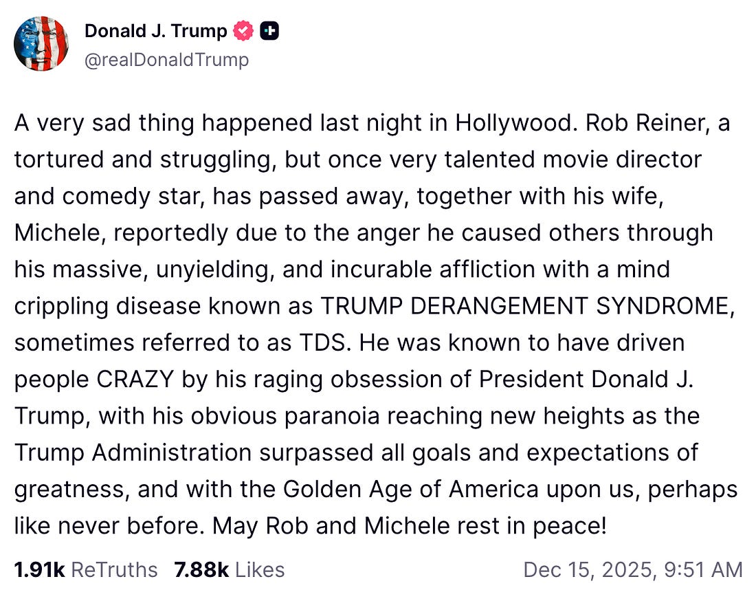 Translation: A country can do something about gun violence and mass shootings. If it wants to. Oh, and one other note: The prime minister who pushed the NFA through so quickly after the Port Arthur massacre was John Howard, who was a pretty conservative figure in Australian politics. A serious country populated by serious people is not helpless to solve its problems. Americans preen and posture as if they want to do something about random gun violence and mass shootings. But we do not. A majority of Americans have decided that active shooter drills and school massacres are an acceptable price for preserving our gun regime. What makes us unserious is that practically no one in this majority is willing to state this revealed preference openly. And to think that some of us were surprised that Americans could elect Donald Trump. Twice. 2. Rob ReinerSpeaking of unserious people, America’s president took to Truth Social this morning to offer his thoughts on the murder of Rob and Michele Reiner. What an amazing statement:
