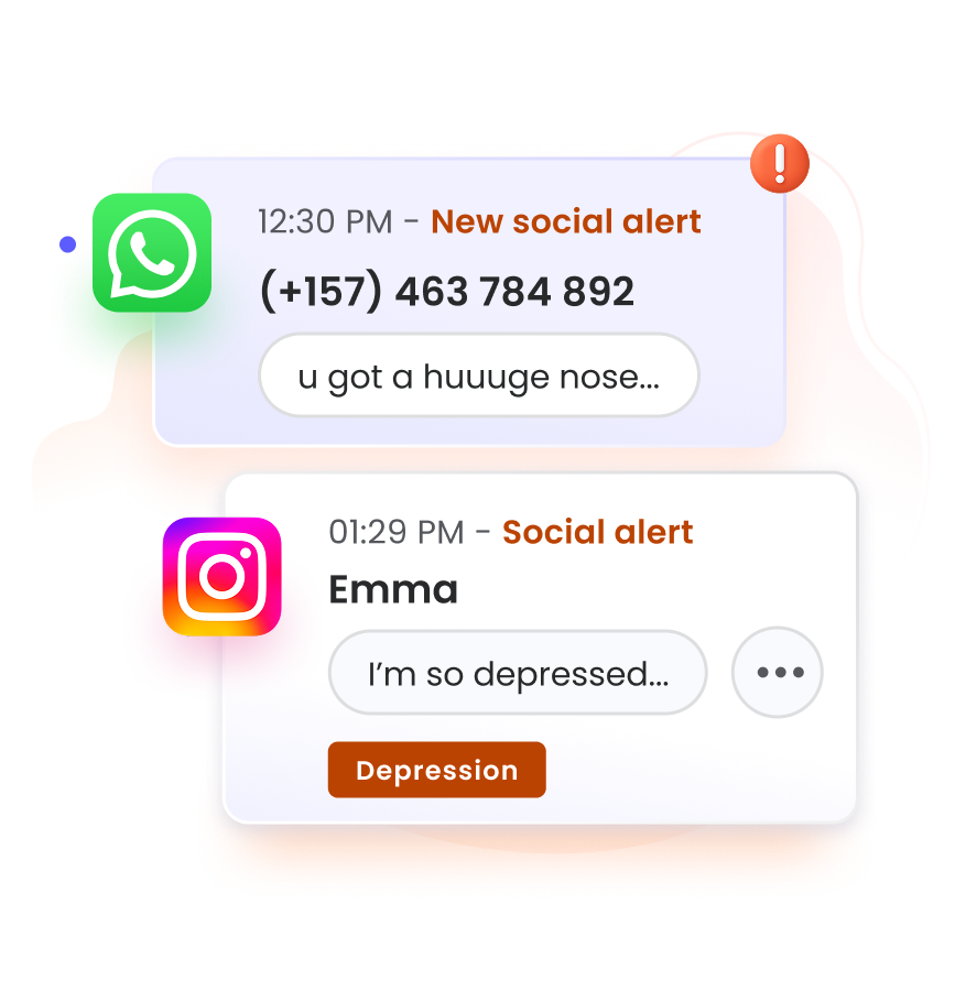 Get real-time alerts With Premium, you’ll get instant alerts when something concerning appears in your child’s texts, WhatsApp, Instagram, Snapchat, TikTok, and X chats*. *Calls & messages for iOS requires a Windows or Mac computer. Unlimited includes your family devices and does not apply to schools or businesses. Instagram, Snapchat, TikTok, and X message alerts are only available for Android. |