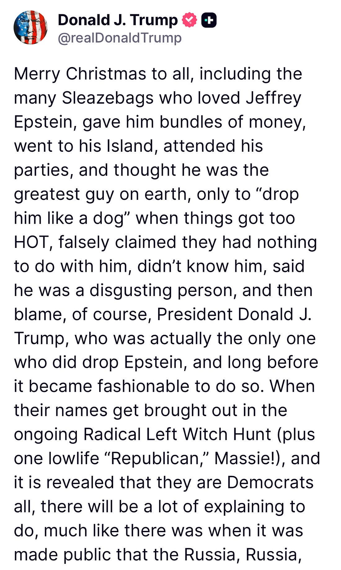 No one should be surprised by Donald Trump‘s Christmas day social media post. It’s completely in character. But let’s look a little deeper and see what he’s really telling us. Donald Trump suggests that he has a lot of information to offer about Jeffrey Epstein, which makes sense given all the photographs of them together and documentation of their close their friendship, like the drawing included in Epstein‘s birthday book that has been attributed to Trump (he has denied it). He looks like a witness to me! In his social media post, Trump offered up some specifics that he might have more information about: