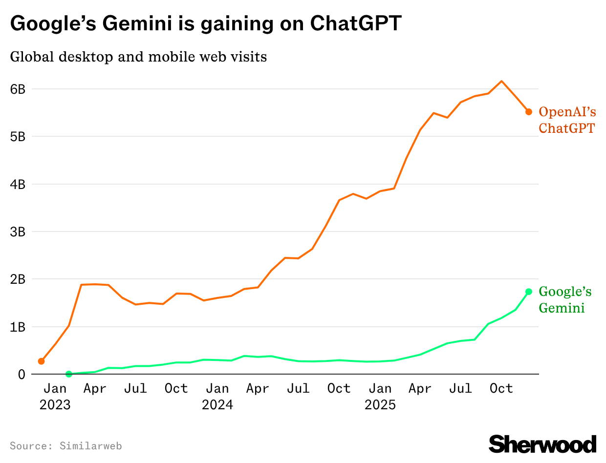So far, Google’s AI efforts seem to be paying off. Traffic to Gemini’s website increased 28% in the last month, according to Similarweb, while ChatGPT’s shrank nearly 6%, though on an absolute basis ChatGPT is still well ahead. |