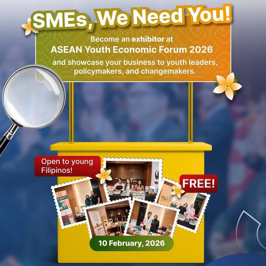Apply before Jan 24, 12NN. Showcase your sustainable products, innovative solutions, and creative ideas at the AYEF 2026 Youth Enterprise Booths! Connect with fellow changemakers, gain market exposure, and inspire ASEAN-Japan SME growth. #Manila
