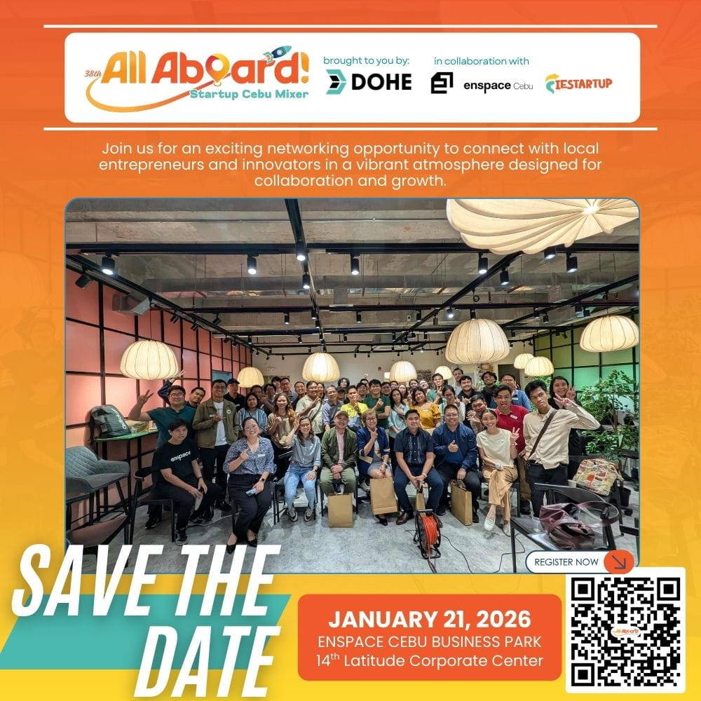 Wed, Jan 21, 6PM. The 38th All Aboard! Startup Cebu Mixer is happening, and we’re starting the year with a blast — celebrating the wins of 2025 and stepping into 2026 with courage, optimism, and excitement for what lies ahead. #Cebu