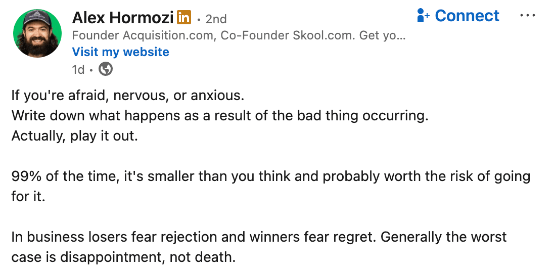 In the end, it isn’t worth it. Instead? Target clients with budget. It will make you more money for less stress. Trust me. 2. How I Generate $50,000 a Month Using Strategic PartnershipsMost people don't realize that over half of my monthly recurring revenue ($50,000/month) comes from this channel: Strategic partnerships Not cold email. Not paid ads. Not SEO. Strategic partnerships is essentially creating a network of people who send you referrals. They can be clients, but they're also: - Former clients In this video, I'll teach you how I built my referral partnership system, including how to reach out to potential partners and how to incentivize them to keep sending you clients. Click here to watch the video. 3. Inspiration: Fear SettingTim Ferriss popularized the idea of fear setting. It's an exercise where you define your fears, considering the benefits of action, and calculating the costs of inaction. I find that most businesses are killed by inaction rather than the wrong actions. Give it a try. Alex Hormozi summed it up well here: 4. Post Lab: LinkedIn Post Feedback (Academy Members Only)Every week in Copyblogger Academy, we provide feedback on your LinkedIn posts and newsletters in Post Lab. If you're an Academy member, you can submit your work for feedback and view the feedback videos. Lesson of the week from this LinkedIn Post Lab: Clarity > Cleverness in your hook: What will people learn by reading your post? Here's the original student's hook: "The CEO needs guidance. HR gives data. It's unclear what the point of this post is or what we'll talk about. Here's how I rewrote it for clarity: "Most HR leaders think their CEOs want data. This hook makes it clear what we'll talk about: a key concept the top 1% of HR leaders know their CEOs want. It creates a curiosity gap but is still clear what we'll talk about. Watch the video inside Copyblogger Academy to see the full feedback session. P.S. - Not a member? |