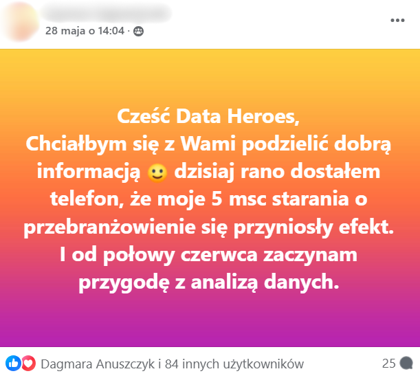 Bywały dni, kiedy czuł, że wszystko jest przeciwko niemu. Ale nie odpuścił. Aż w końcu dostał jeden wymarzony telefon i opublikował piękny post na grupie Data Heroes.