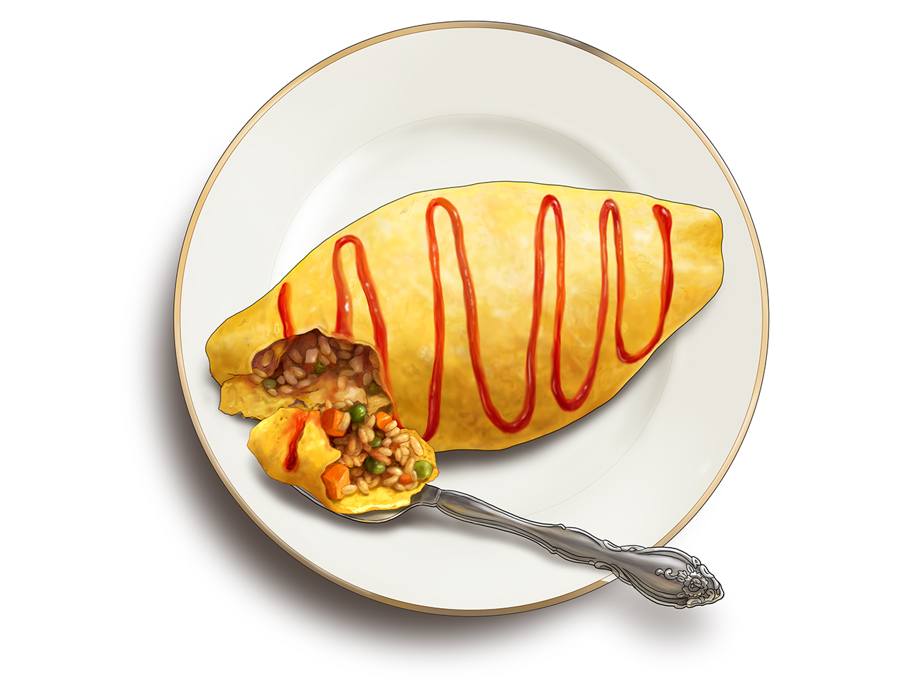 9. Repeat for the second serving. Spoon some ketchup over the omurice and serve immediately.