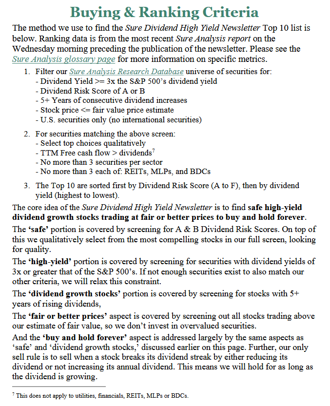 Data from Sure Analysis is our primary source to rank our universe of securities for the Sure Dividend High Yield Newsletter. The exact ranking methodology is shown below.