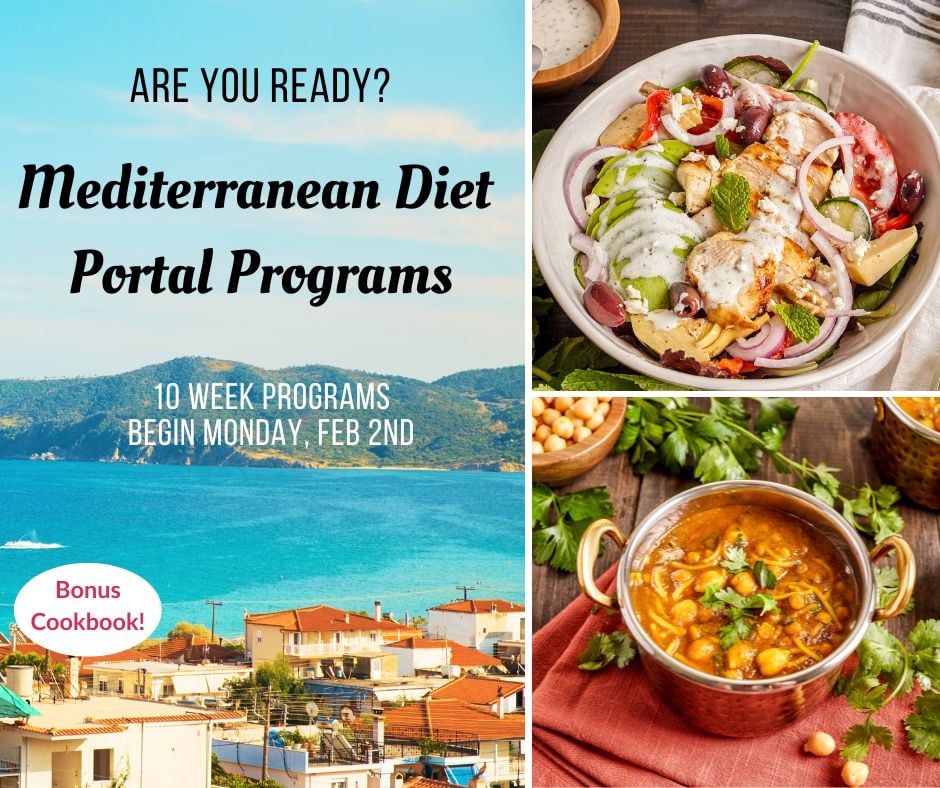 Join our Mediterranean Diet Portal today and receive 1 year of webinars, meal plans and recipes plus our 10 week Mediterranean Diet Weight Loss Program, 10 Week Mediterranean Way Program and 30 day clean eating program.