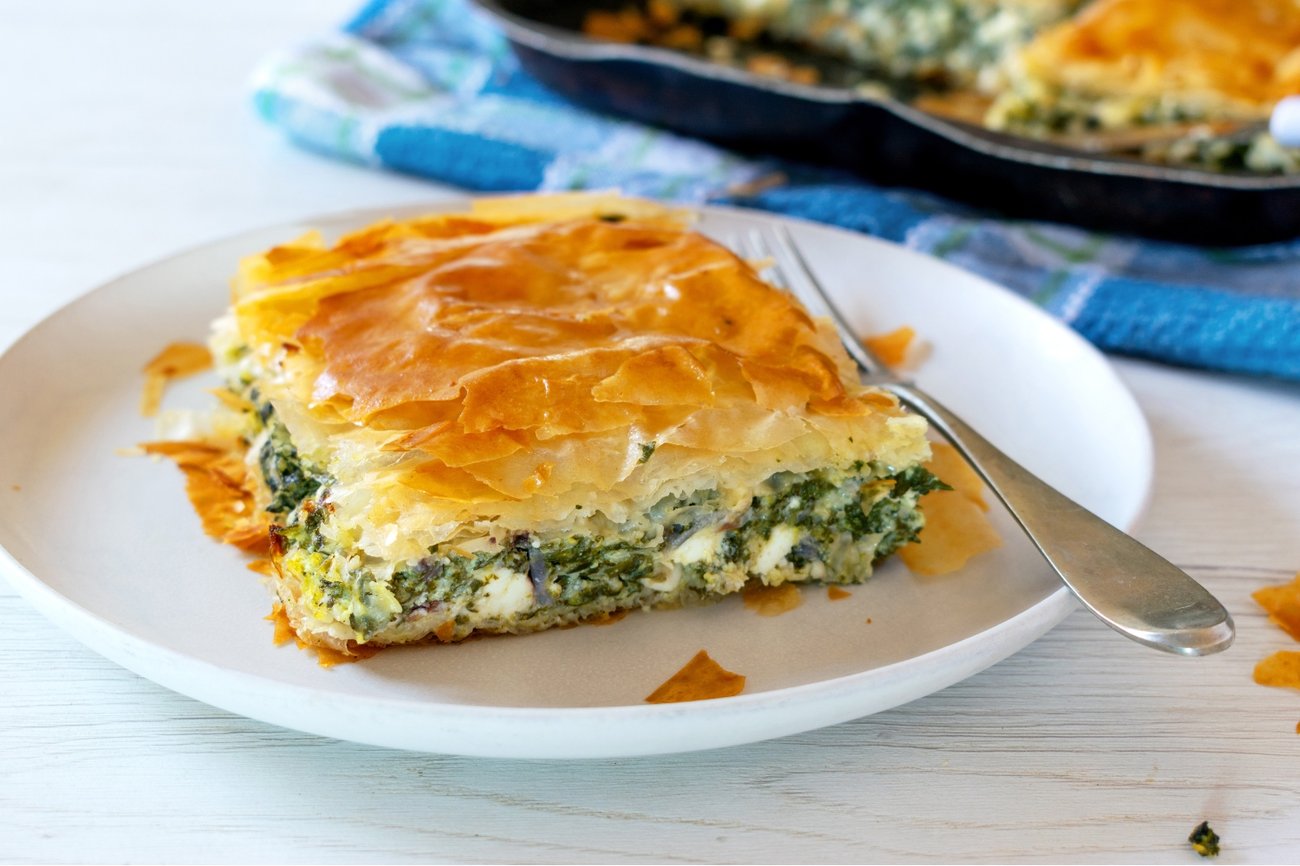This classic Spanakopita recipe features flaky phyllo,‌ spinach,‌ feta,‌ herbs,‌ and olive oil for a wholesome Greek favorite.‌
