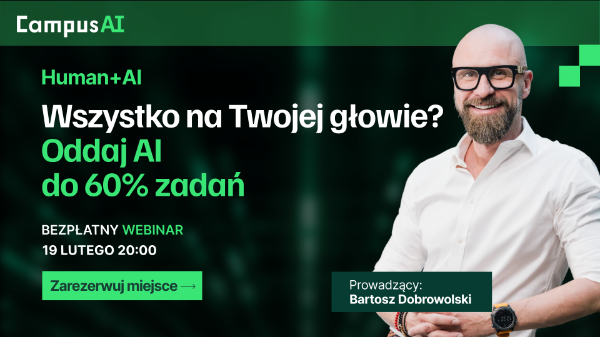 Już 19.02.2026 (czwartek) o 20:00 odbędzie się szkolenie online „Human + AI, czyli jak wykorzystać Sztuczną Inteligencję, żeby zarabiać więcej, pracować mądrzej, rozwijać się szybciej” - oparte na praktycznych przykładach z firm, które wdrażają AI na co dzień.
