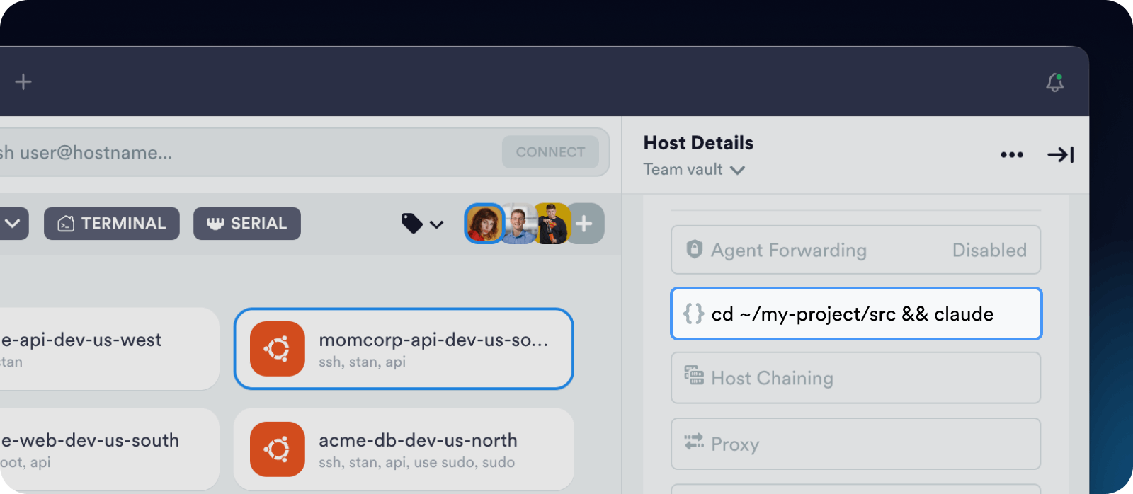 You can automate this by adding a Startup Command like cd ~/my-project/src && claude to your host. Now, when you connect, you’re already inside your project folder with your agent running.