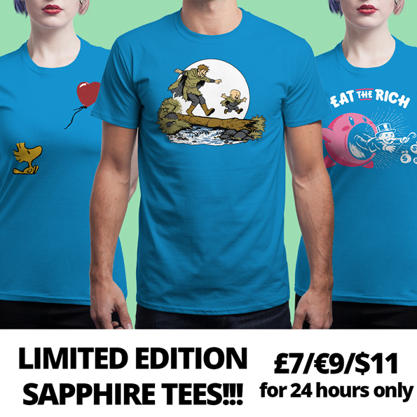 Suffice to say, here at Qwertee, one of our absolute favourite things to do is give you limited edition incredible tees! So when we get the chance to offer EXTRA limited edition tees, we love it! For 24 HOURS ONLY we have the designs below available in SAPPHIRE COLOURED TEES for a reduced £7/€9/$11! They're our favourite limited edition colour we've done so far! We have NEVER had this colour on sale before and we won't be doing it ever again so not only are these designs limited edition, the tees themselves are EXTREMELY LIMITED EDITION! Stock is extremely low though so do not wait to pick yourself up a piece of Qwertee history!