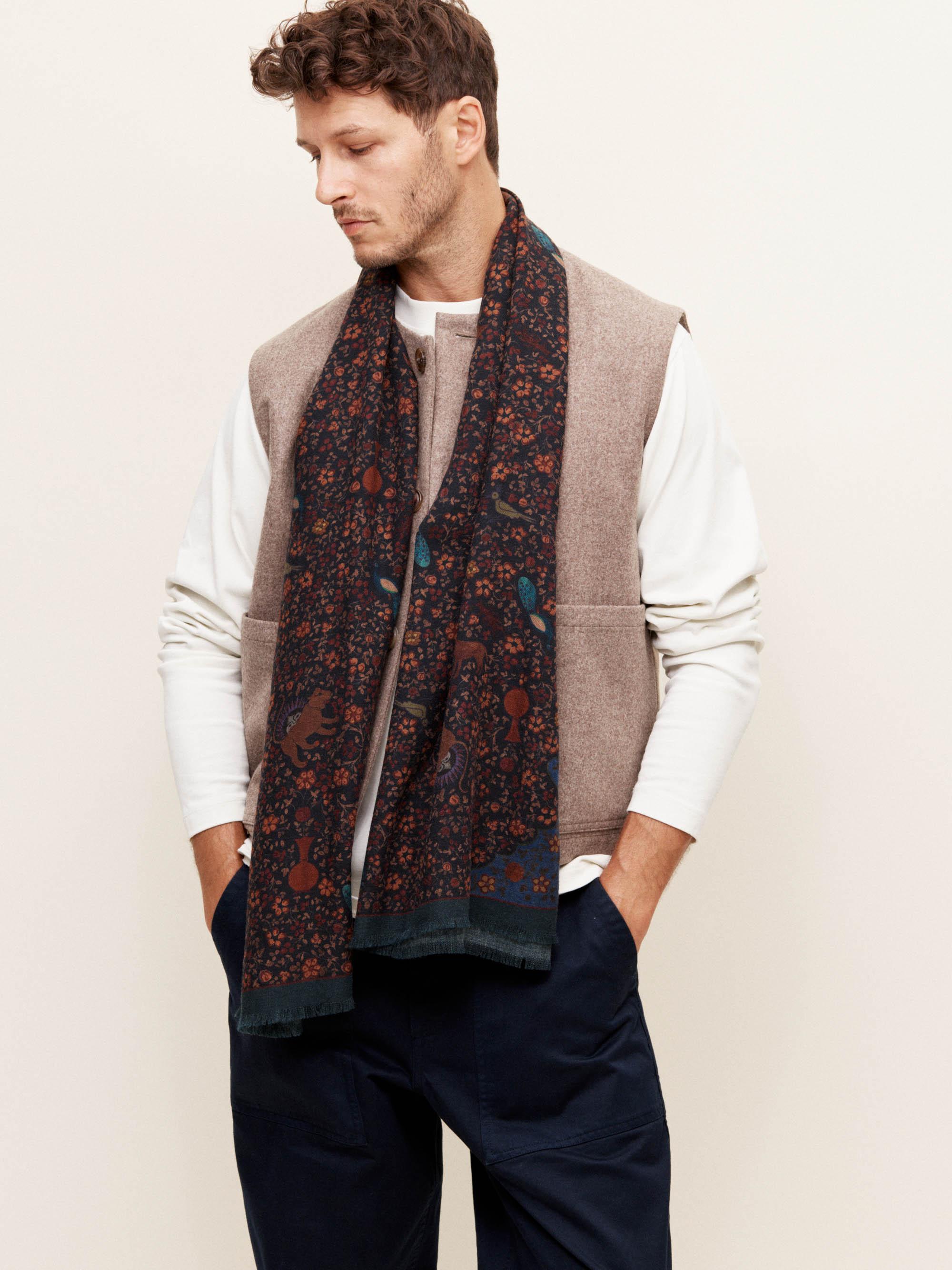 Made in collaboration between Parisian menswear brand De Bonne Facture and Monocle, this fringed scarf has an exclusive pattern, size and shape available only at Monocle. Featuring an ancient Persian lion symbol, sun and mystical animals set on a forest-green background, each piece also includes a handwritten signature from the De Bonne Facture founder Déborah Neuberg. Printed and sewn in Como by Italian scarf specialists.