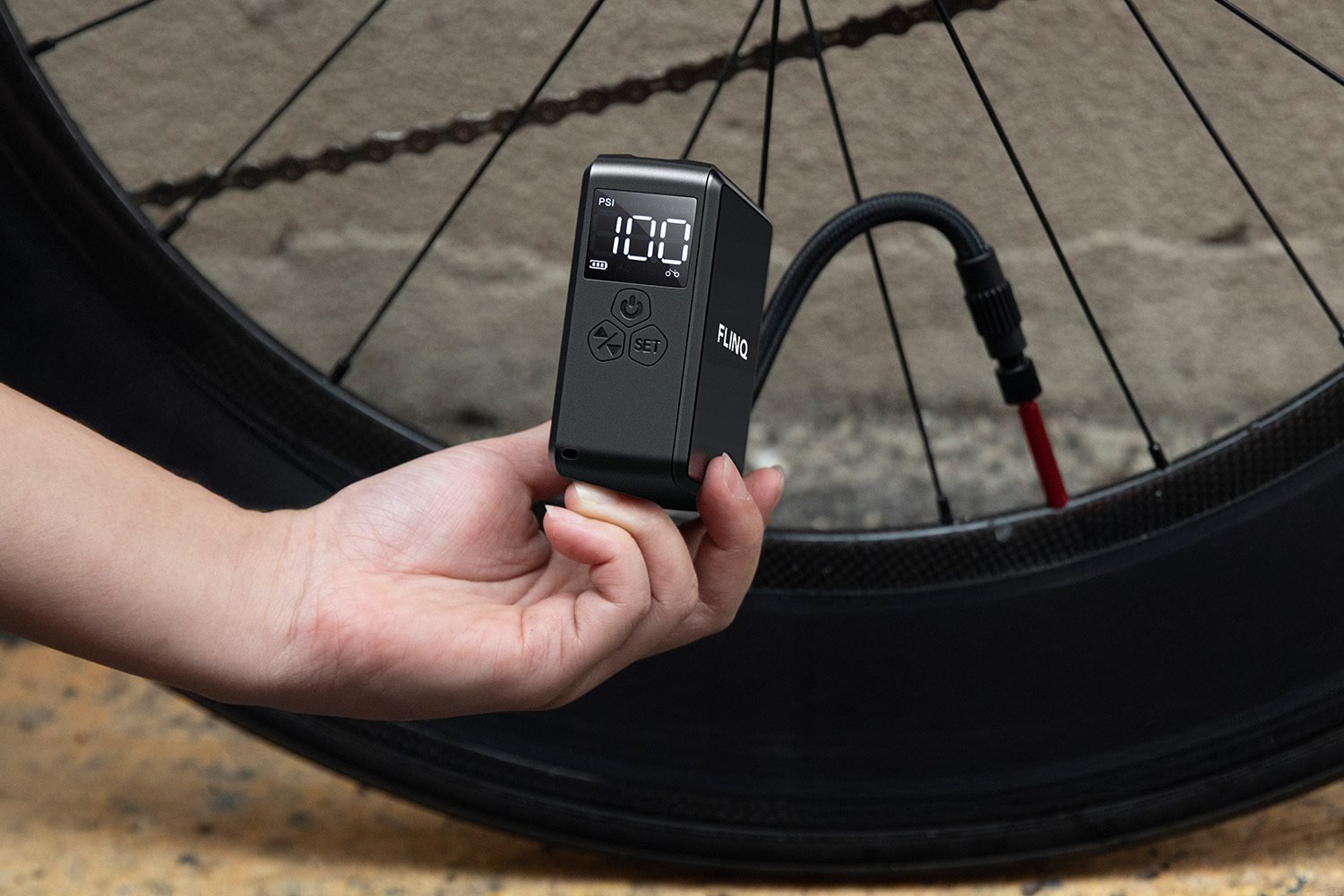 Compacte en draadloze luchtcompressor - FlinQ | Geschikt voor fiets-, auto- en motorbanden | ✔️ Geen luchtslang nodig ✔️ USB-C oplaadbaar ✔️ Vooraf ingestelde presets per type voertuig | 59,95 | i.p.v. 99,95 - 40% | |