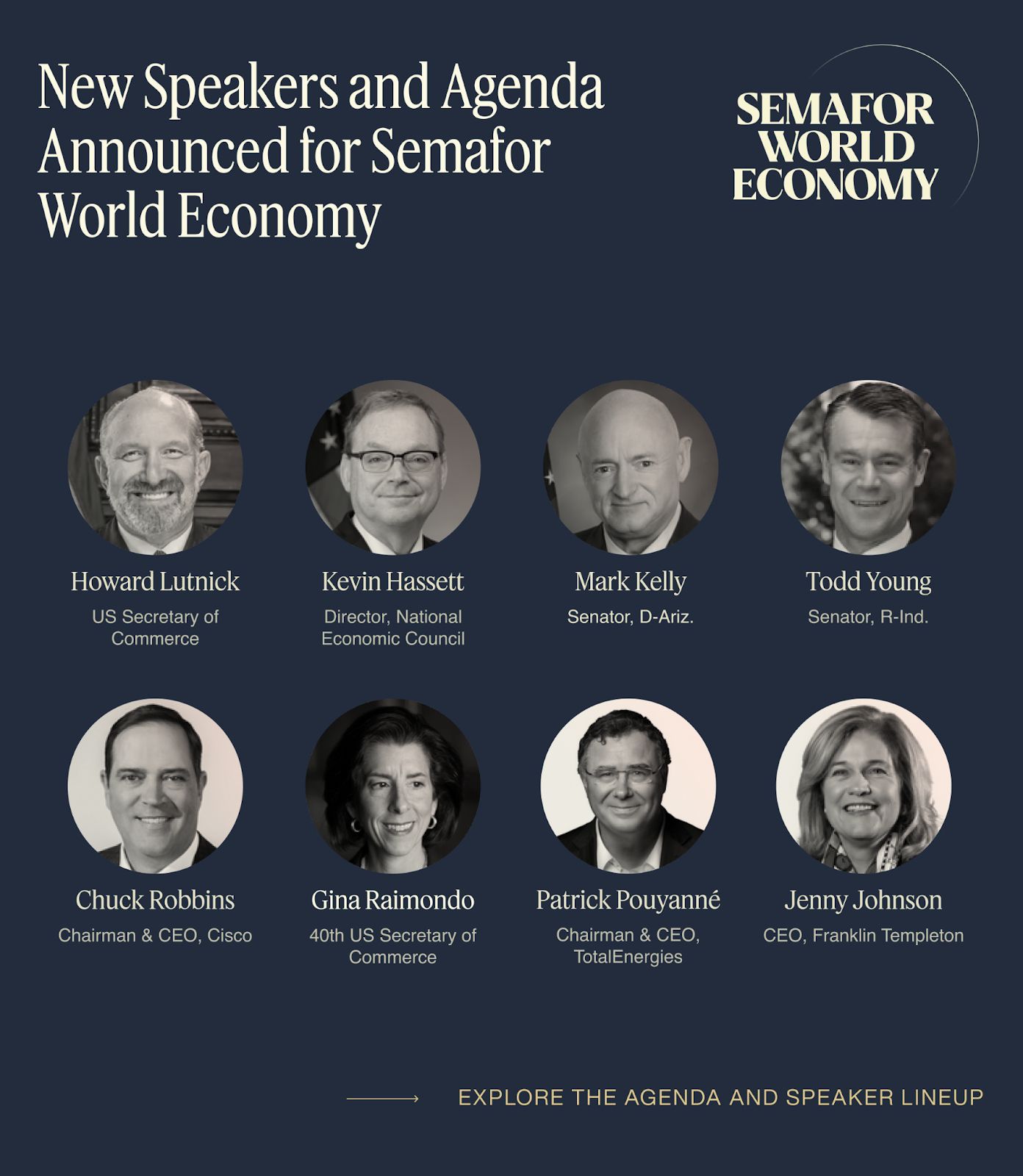 This April, global CEOs, officials, and industry leaders will join Semafor World Economy — the largest gathering of government and executives in the US — to sit down with Semafor editors for conversations on the forces shaping global markets, emerging technologies, and geopolitics. See the full lineup of speakers, including Global Advisory Board members, Fortune 500 CEOs, and elected officials from the US and across the G20. |