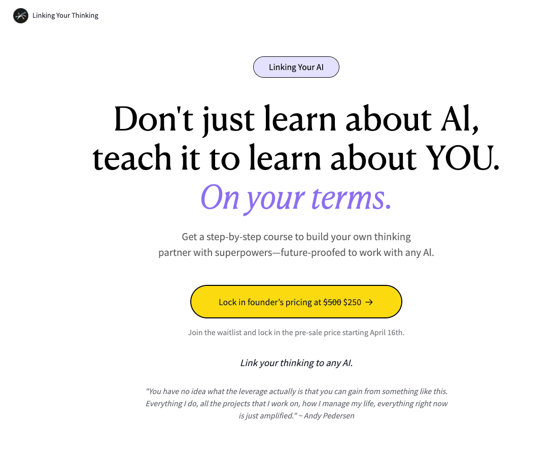 That's why we have created the 14-lesson course "Linking Your AI." It's a game-changer at an inclusive price. You will get a step-by-step course to build your own thinking partner with superpowers—future-proofed to work with any AI.
