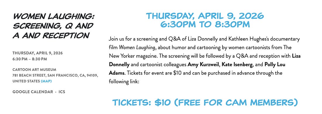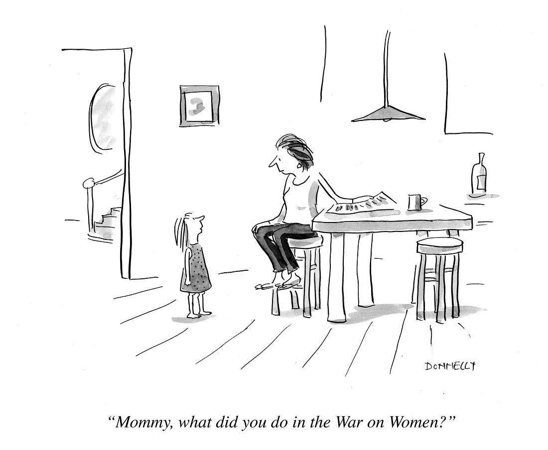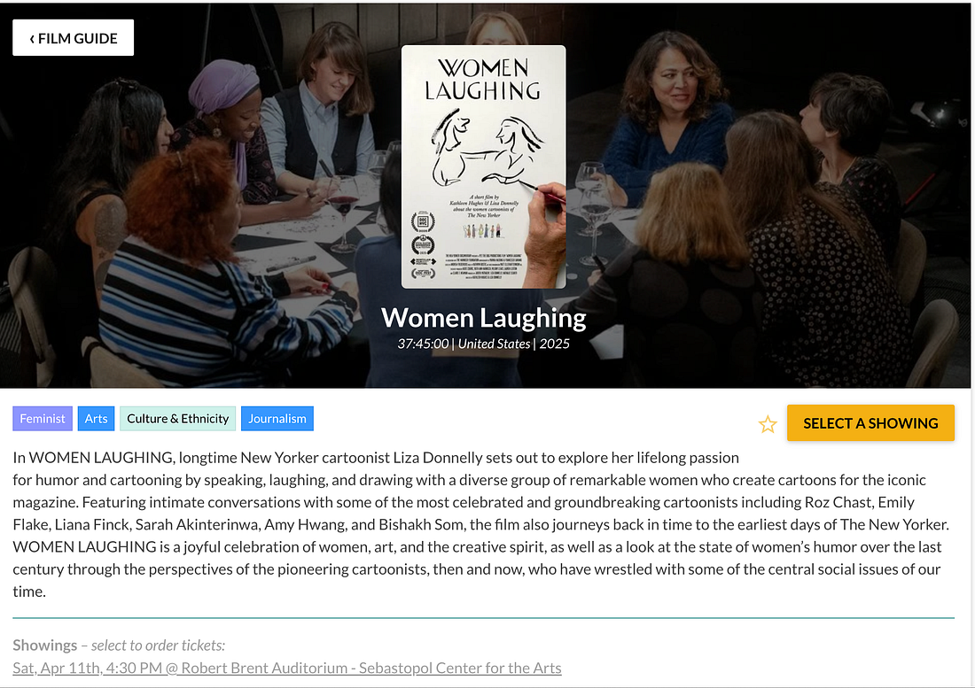 Our documentary about women cartoonists of The New Yorker, Women Laughing, is hitting the trail. We are screening twice in Northern California this week and weekend. If you are in the area, come join us! We hope to arrange screenings in Los Angeles later this year, and Portland and Seattle as well. We plan on visiting other areas and then return to NYC in September for a week-long run! First off, San Francisco! April 9th at 6:30 pm at the Cartoon Art Museum. I will be joined by colleagues Amy Kurzweil, Kate Isenberg and Polly Lou Adams, and producer Judith Mizrachy. Curator Andrew Farago will moderate our Q&A afterwards before a reception of wine and light fare. We were thrilled to be selected to screen at the Sebastopol Film Festival in Sonoma County. I will be joined by WL producer Judith Mizrachy after the screening. Tickets HERE. If you want to keep up with all our screenings around the country and hopefully in places around the globe, you can subscribe to our email list, here. If you have any ideas for screenings in your area, contact me at liza@lizadonnelly.com, would love to hear from you. The drawing below was done a number of years ago (pre-Trump presidency, even the first one) when the phrase “War on Women” was in the news. Now it is even more relevant and real, scarily so. This did not get picked up by The New Yorker, although I submitted it numerous times. You're currently a free subscriber to Seeing Things. For the full experience, |