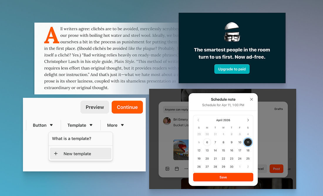 Schedule NotesYou can now schedule Notes to publish at a specific time, on web, iOS, and Android. Write in advance, set a publishing time, and your Note will go out automatically. All scheduled Notes appear in your Notes Drafts tab, where you can continue editing right up until they publish.